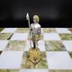 Поле шахмат выполнено из редкого и благородного оникса, сочетающего в себе оттенки белого и глубокого зеленого. Доска и фигуры, отлитые из бронзы, вручную расписаны серебром и золотом, придавая им неповторимый блеск и роскошь. Каждый элемент выполнен с исключительным вниманием к деталям, что делает эти шахматы настоящим шедевром.